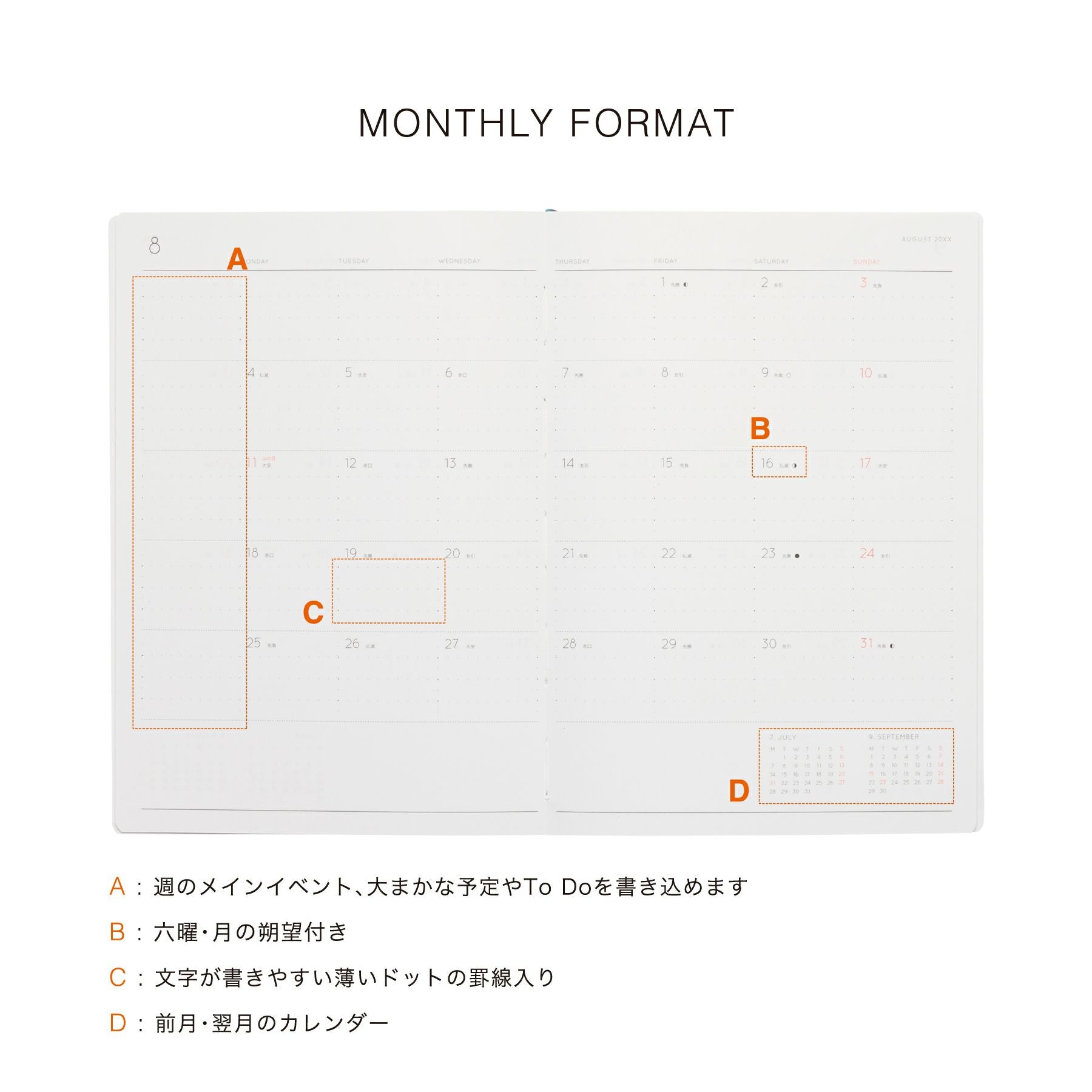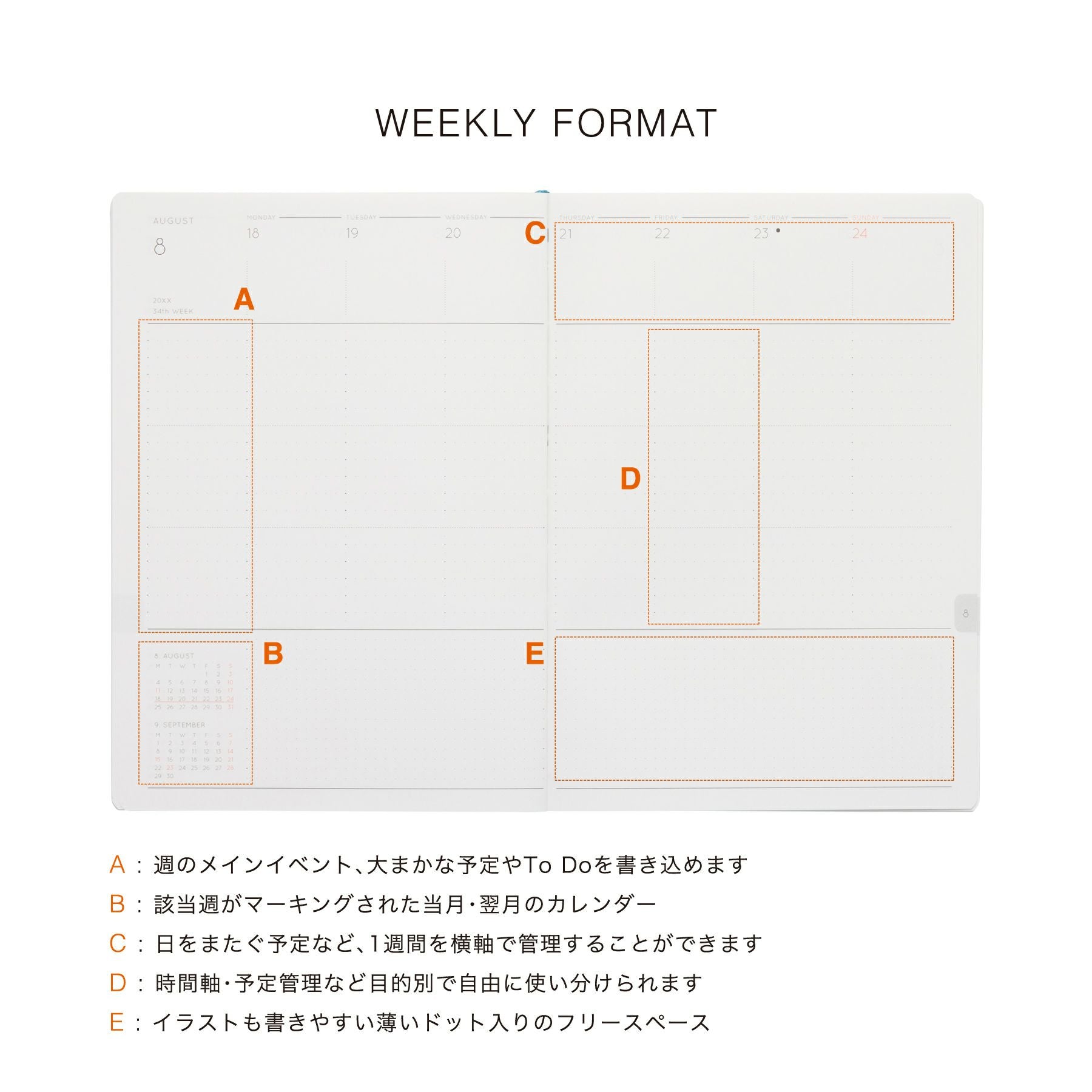 (A) その週のメインイベント、大まかな予定やTO DOを書き込めます