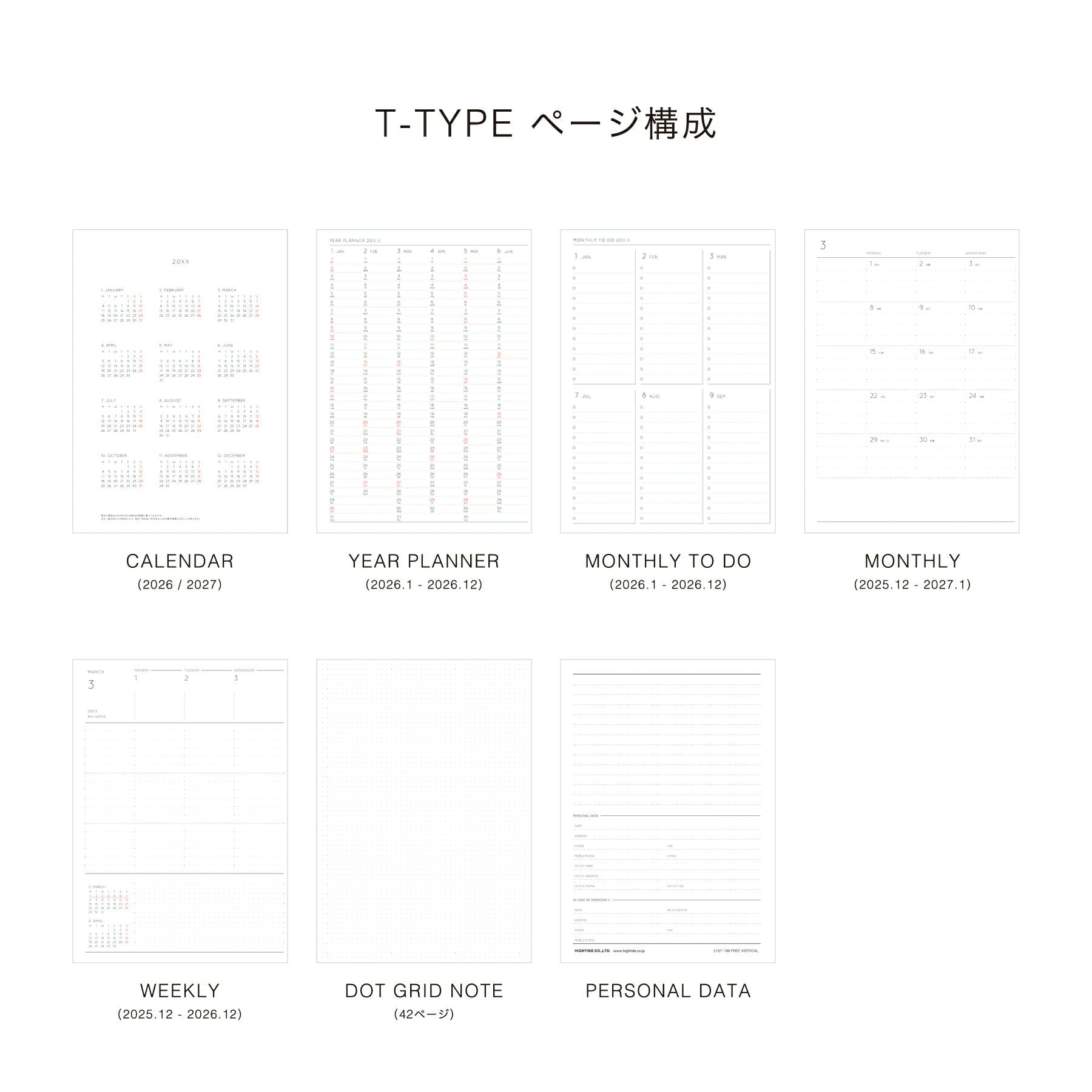 内容 カレンダー、年間スケジュール、マンスリー TO DO、月間スケジュール、週間スケジュール、ノート、パーソナルデータ、月間インデックス