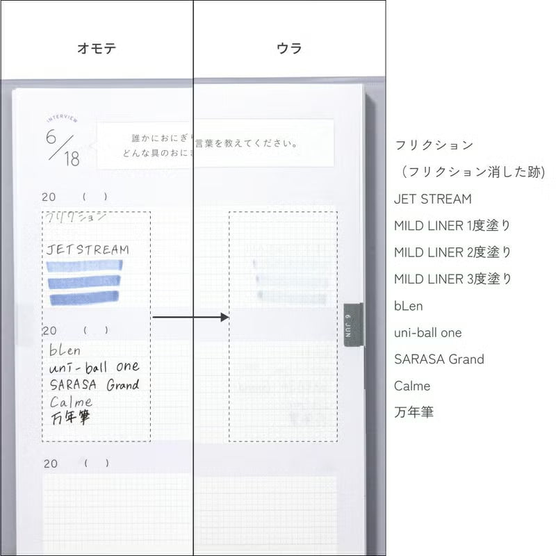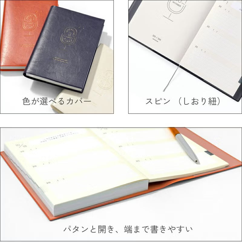 | 注意事項 | ・商品の色は「LINEUP」の写真をご確認ください。できる限り実物の色に近づけるように努めておりますが、お使いのモニターやお部屋の照明等により色の見え方が実物と若干異なる場合がございますので、あらかじめご了承ください。 ・まれに、手帳用紙に黒や白などの小さな点が見られることがあります。製造工程上避けられないものですのであらかじめご了承ください。 ・裏抜けしにくい紙を使用しておりますが、お使いのペンの種類や書き方によってにじんだり、裏に写ったりすることがあります。 ・気温の変化により、PVCカバーのサイズが変化する可能性がございます。 |