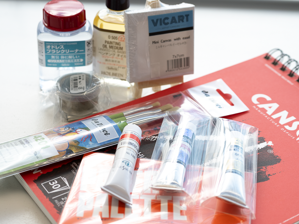 ・その他画材(油彩スケッチブック、筆セット、ペンチングオイル、筆洗液、油つぼ、ペーパーパレット、イーゼル付きミニキャンバス、油絵具)