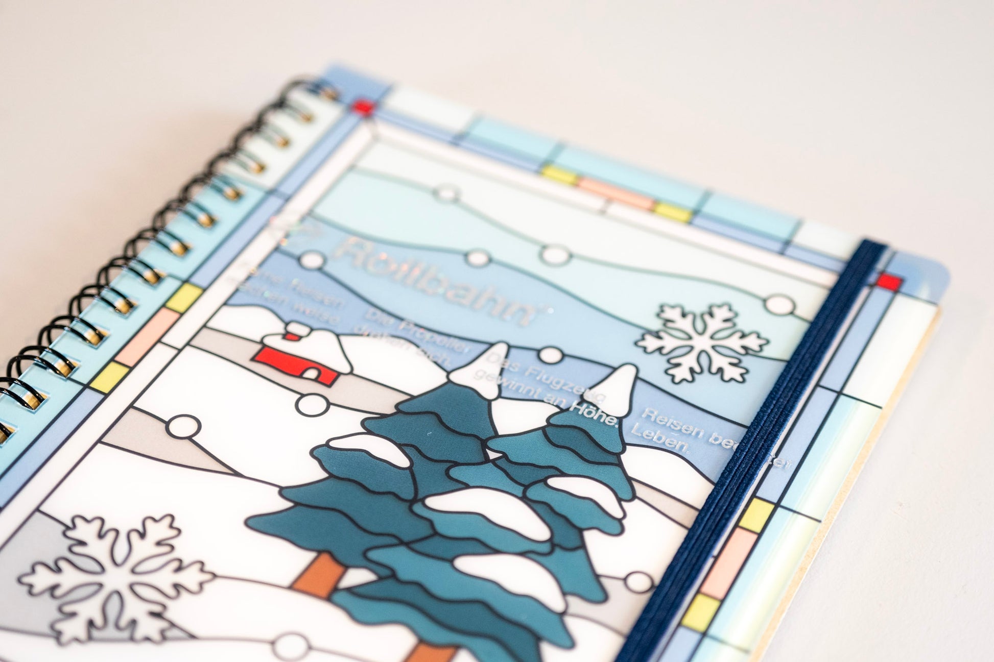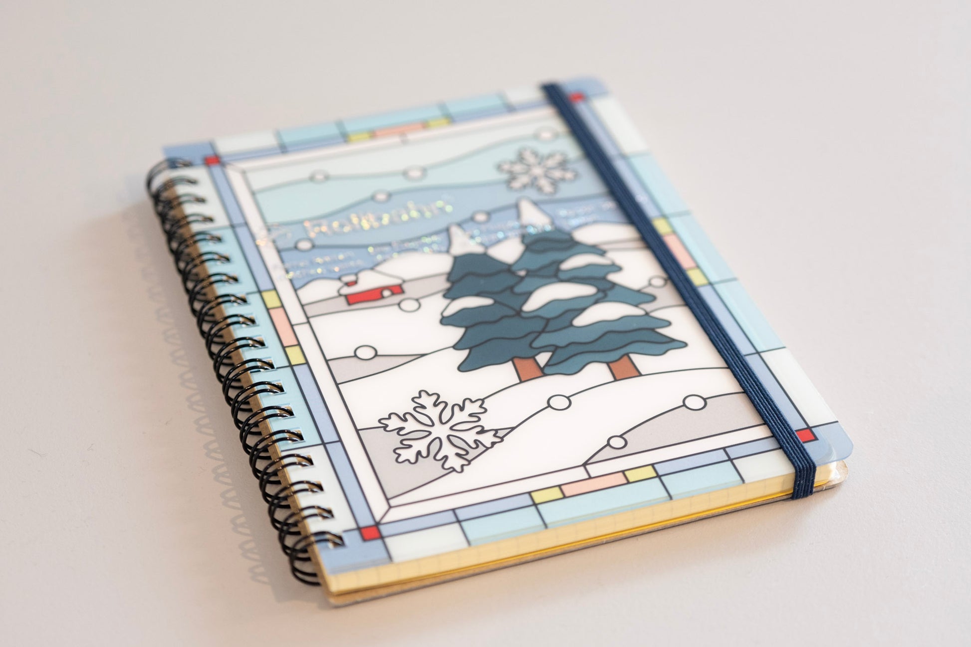 鉛でガラスをつなぎ合わせるステンドグラスの特徴を細部まで描き、ロマンチックな趣きを感じさせます。表紙には透け感のあるクリア素材を使用しているのもポイント。光源にかざすと、まるで本物のガラスのように幻想的な光と影をお楽しみいただけます。