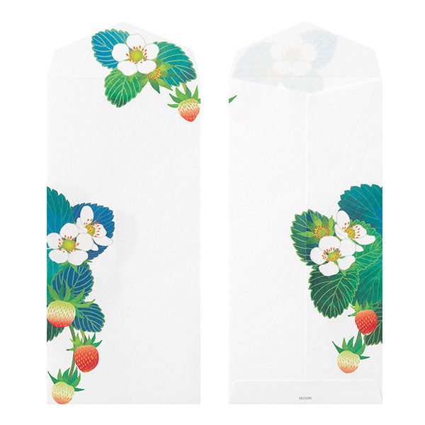 パールシルク箔を施した苺の白い花と、鮮やかな緑色の葉のコントラストが美しく表現されています。