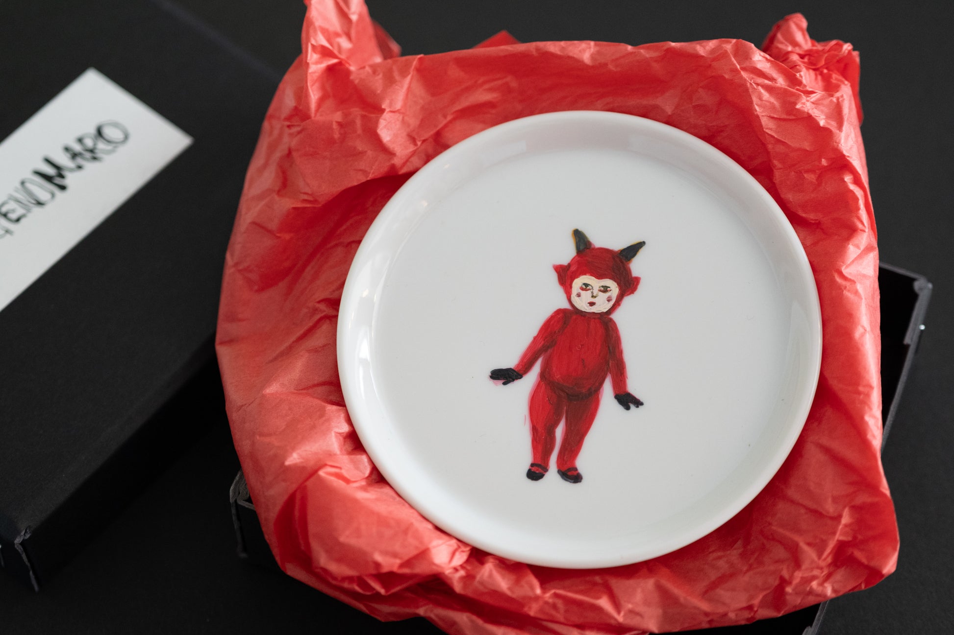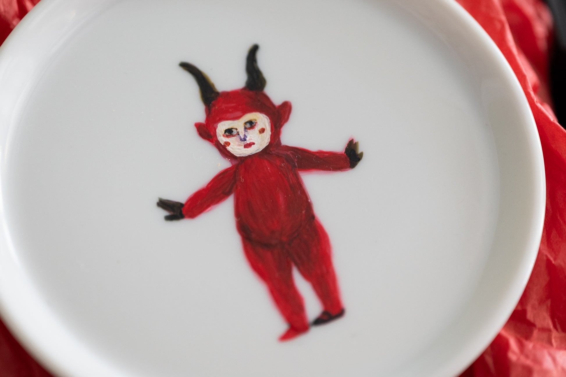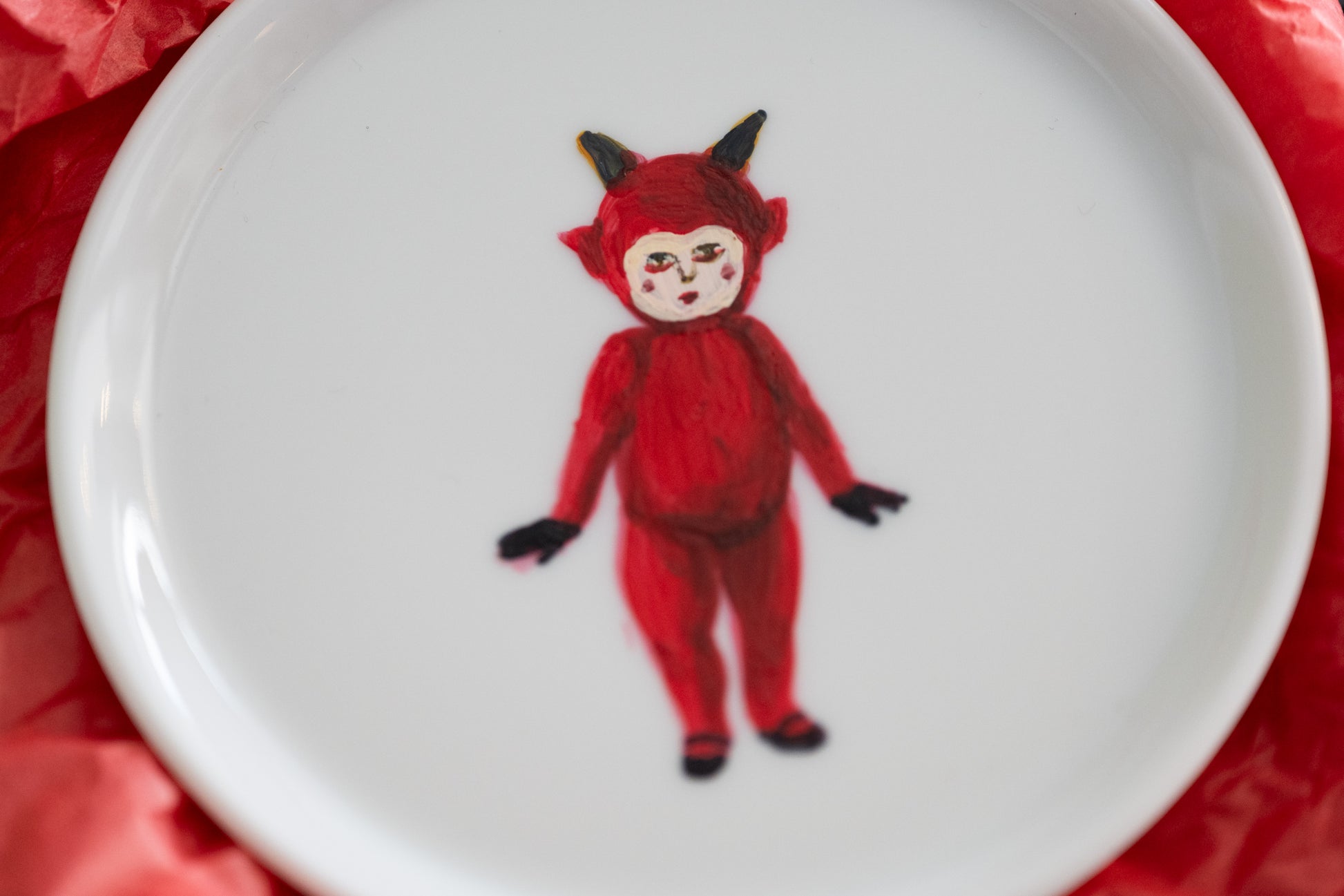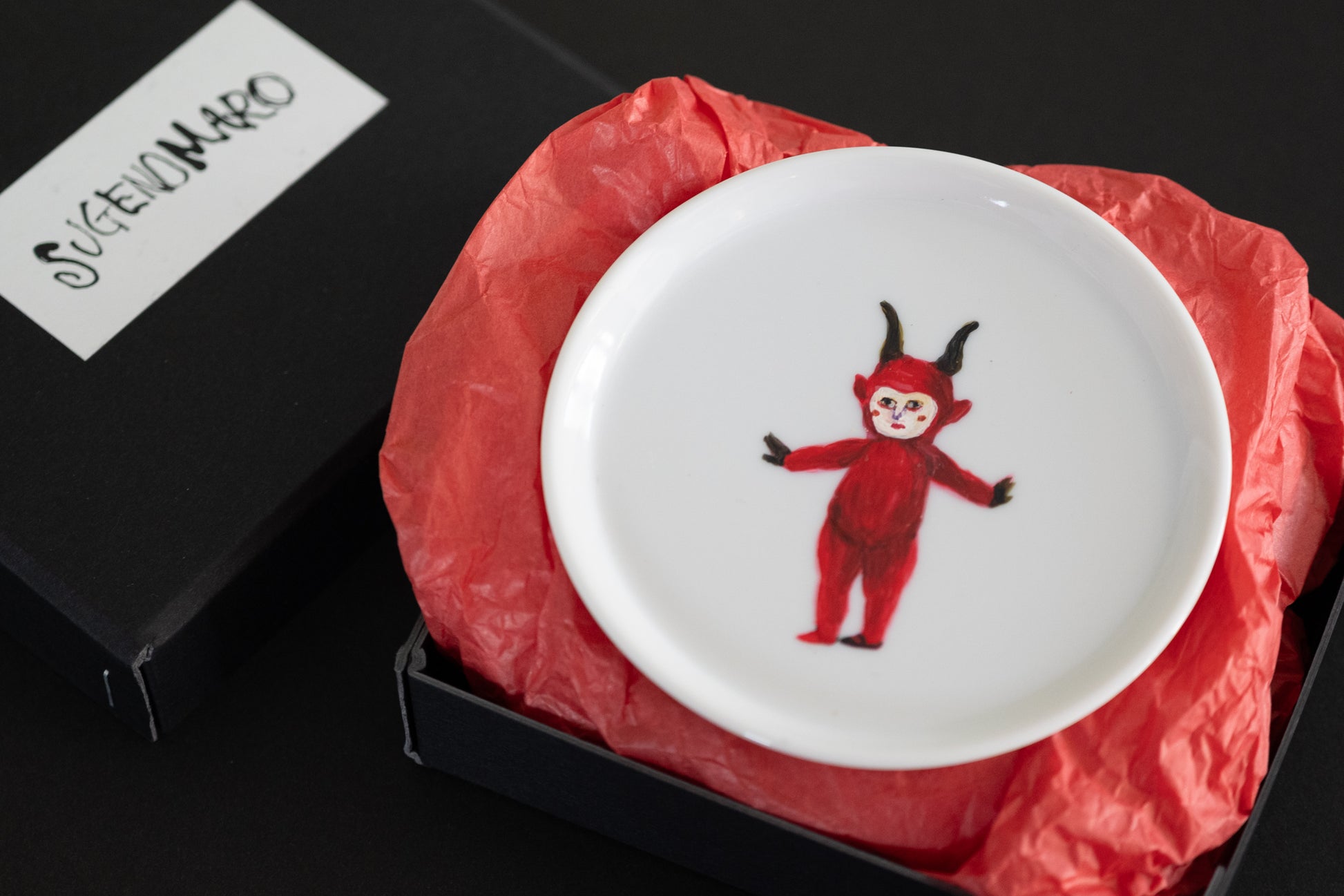 スゲノマロさんが手描きで仕上げた、小さな“悪魔ちゃん”が描かれた陶器のお皿です。