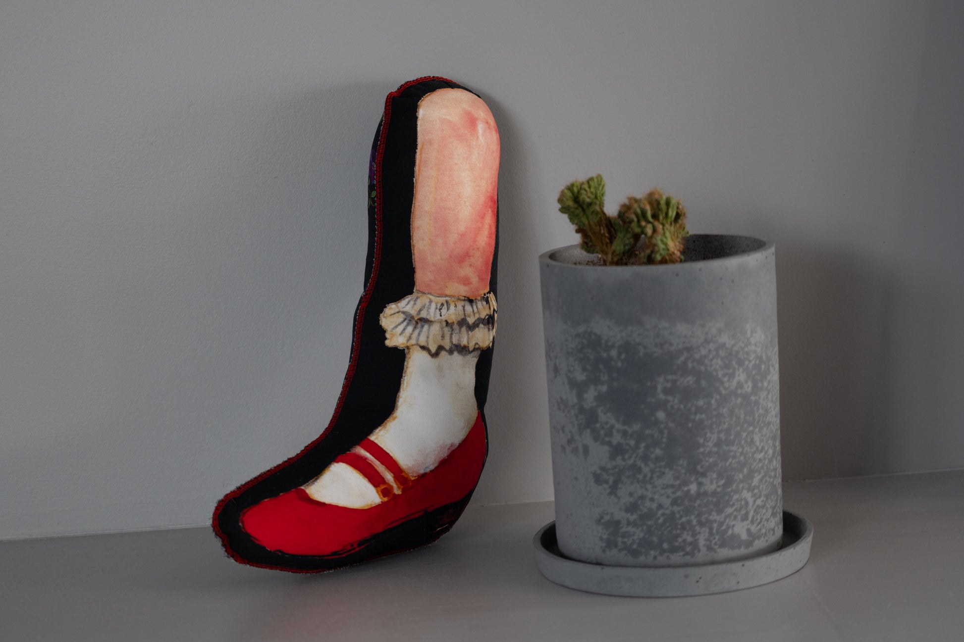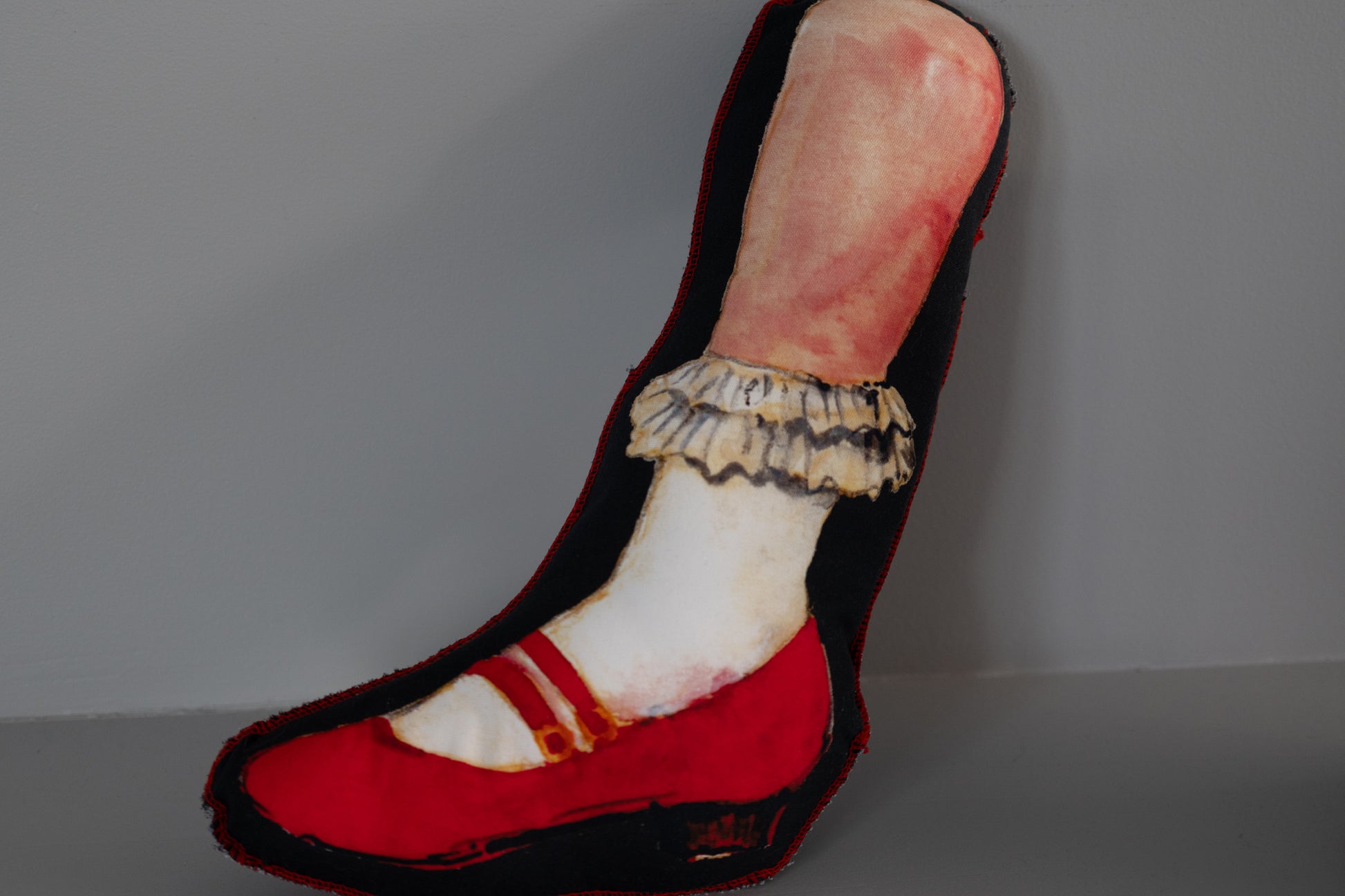 鮮やかな赤いメリージェーンの靴と、柔らかなタッチで描かれた脚のイラストが印象的で、置くだけで空間のアクセントになります。