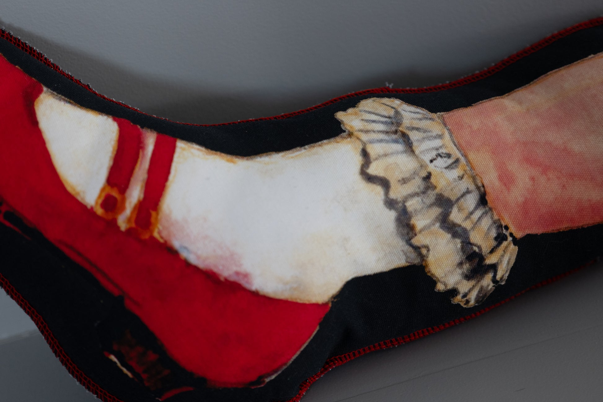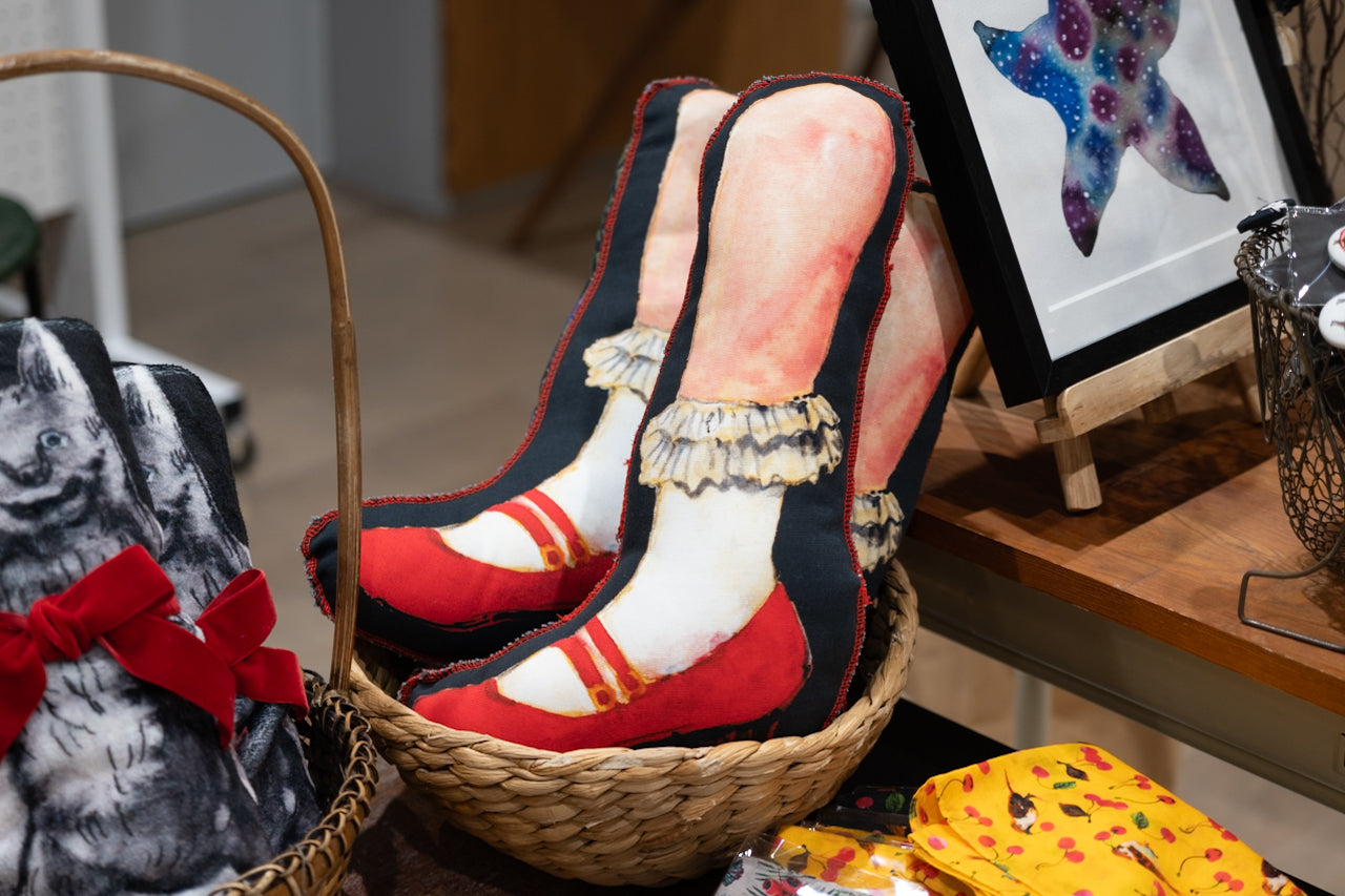 スゲノマロさんが描いた“赤い靴”をモチーフにしたクッションです。