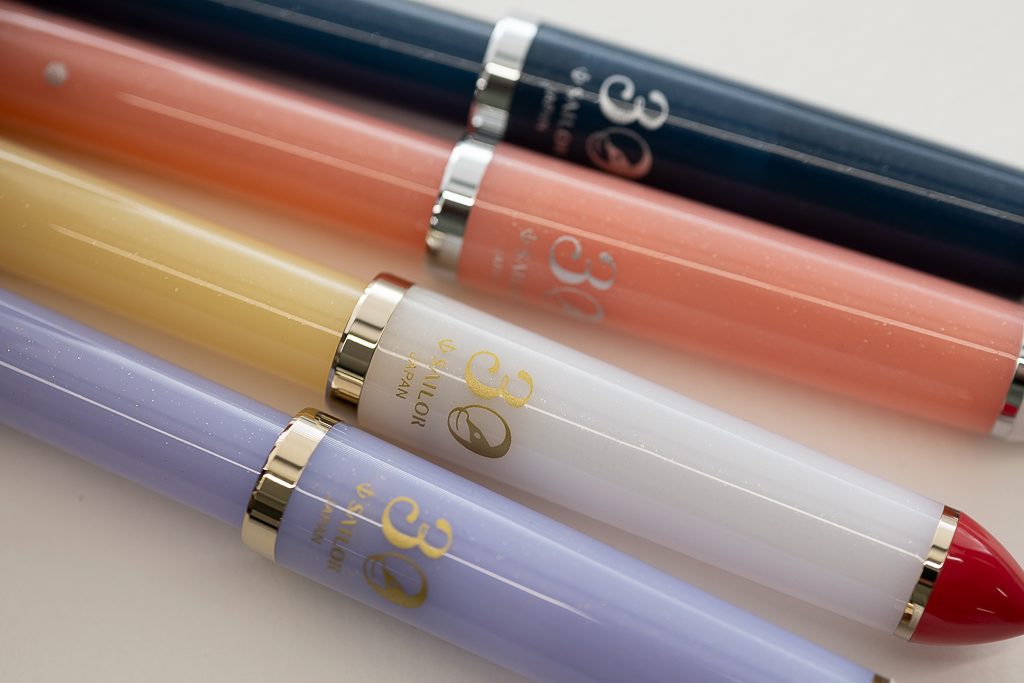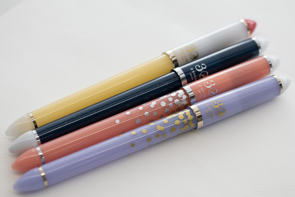 お誕生日ケーキをイメージしたショートケーキ、お誕生日のお祝いパーティーをイメージしコンフェッティ(紙吹雪)をシルク印刷であしらったパープルとピンク、セーラー万年筆のコーポレートカラーである黎明ブルーの全4種類です。