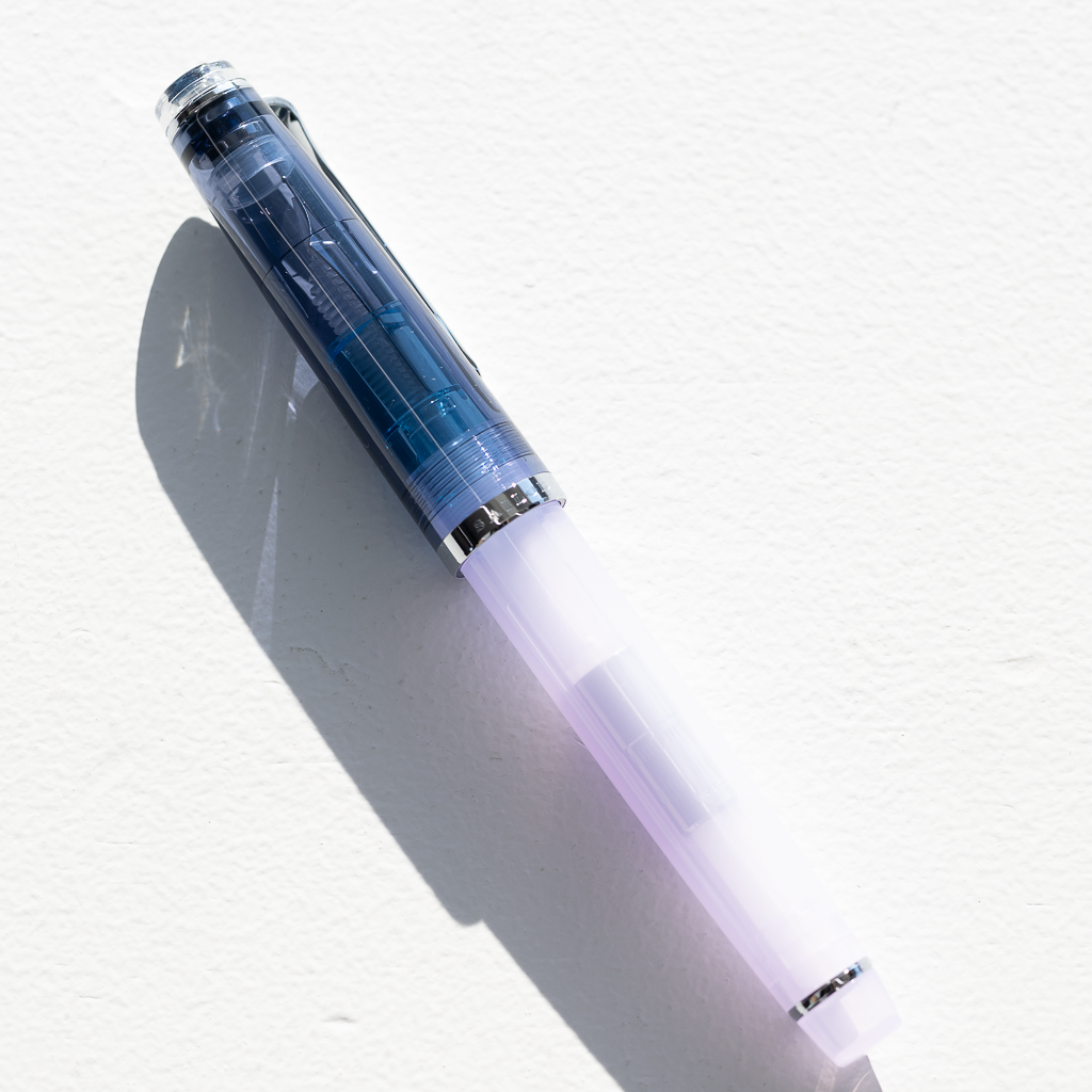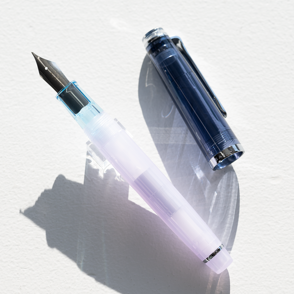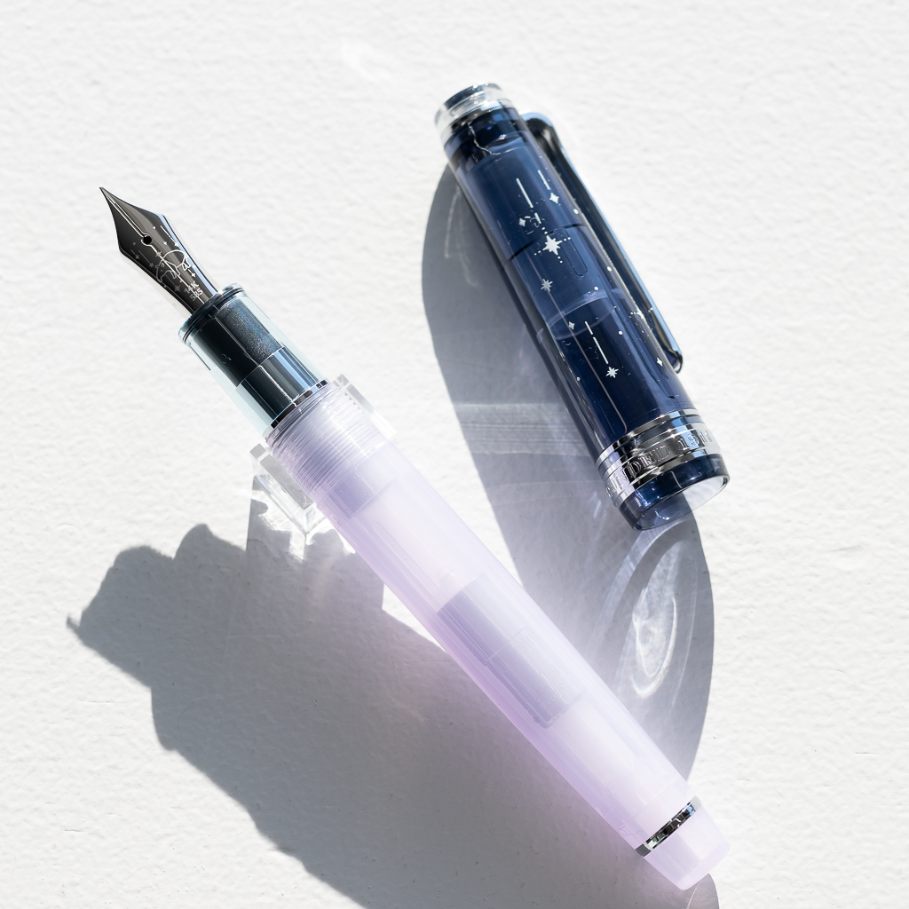 万年筆は、静かな夜のはじまりを感じさせるクリアネイビーの蓋と神秘的な淡いトーンのパープルのボディとを組み合わせました。