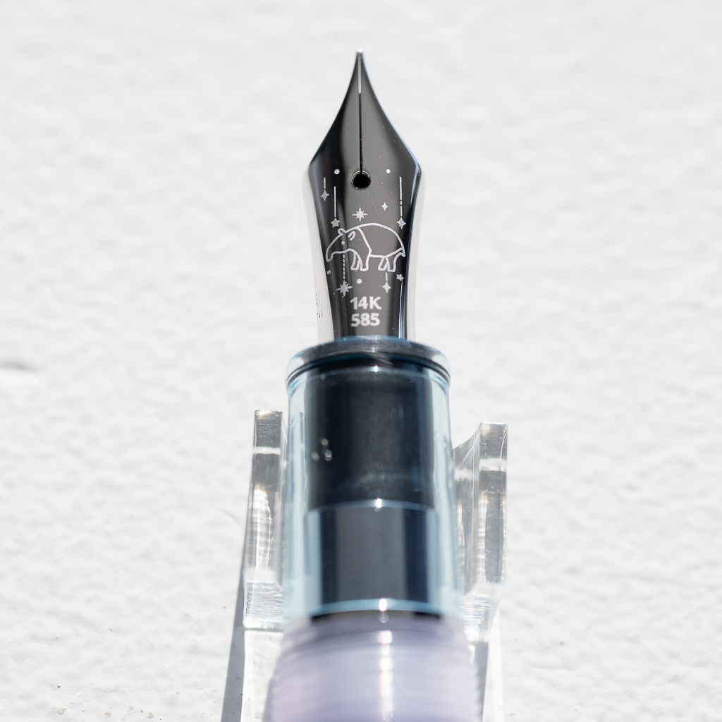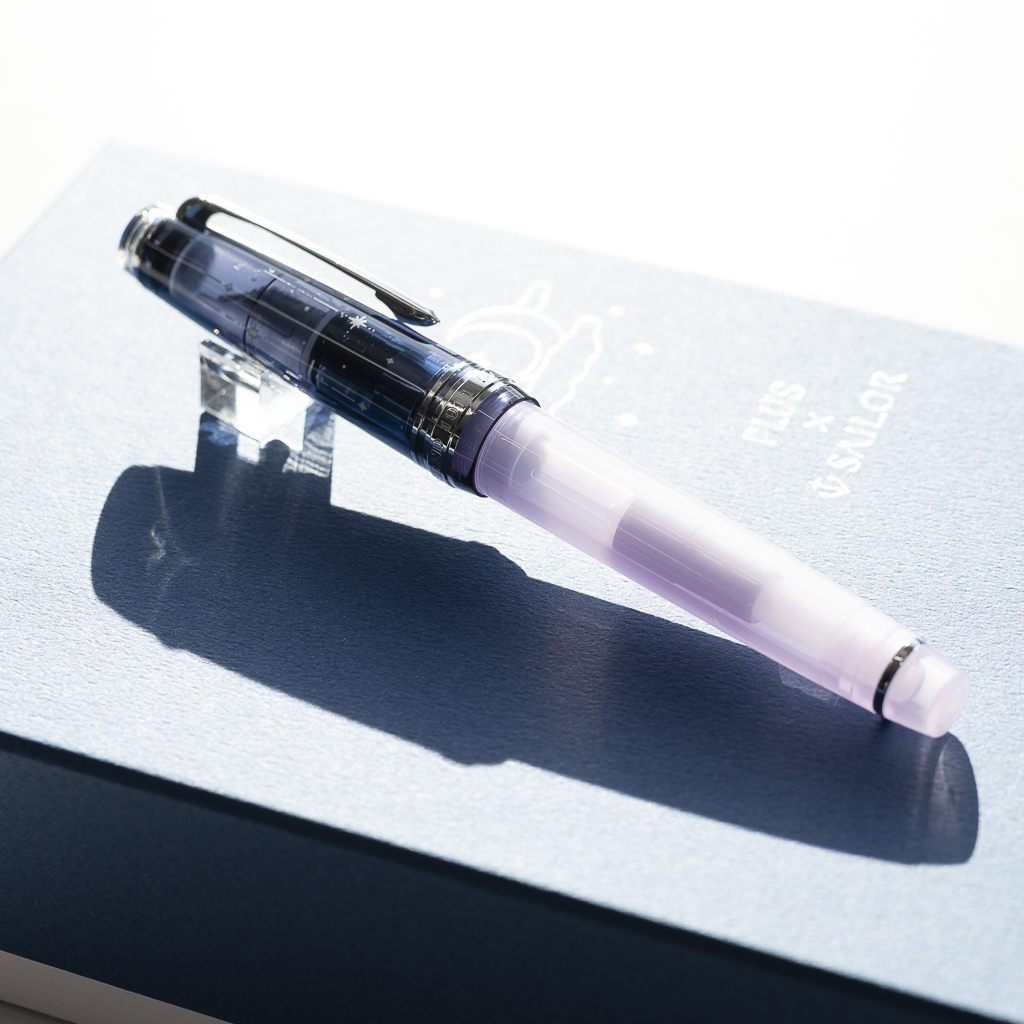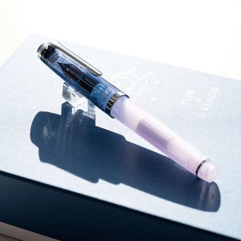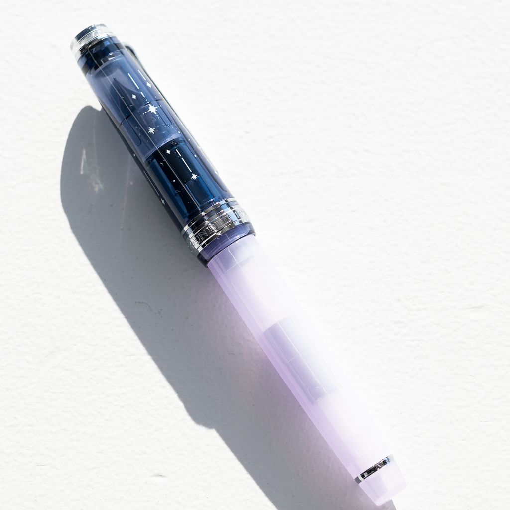万年筆は、静かな夜のはじまりを感じさせるクリアネイビーの蓋と神秘的な淡いトーンのパープルのボディとを組み合わせました。