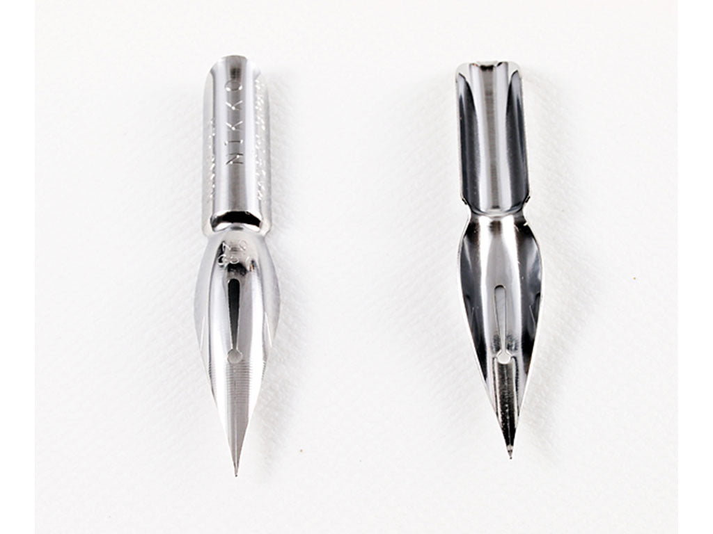 若干の線の強弱(太い線、細い線)と均一な太目の線が書けるペン先です。ペン先を紙に沿って寝かせることで、線の強弱が出ます。均一の太目の線がでます。クローム色で錆に強いことも特徴のひとつです。