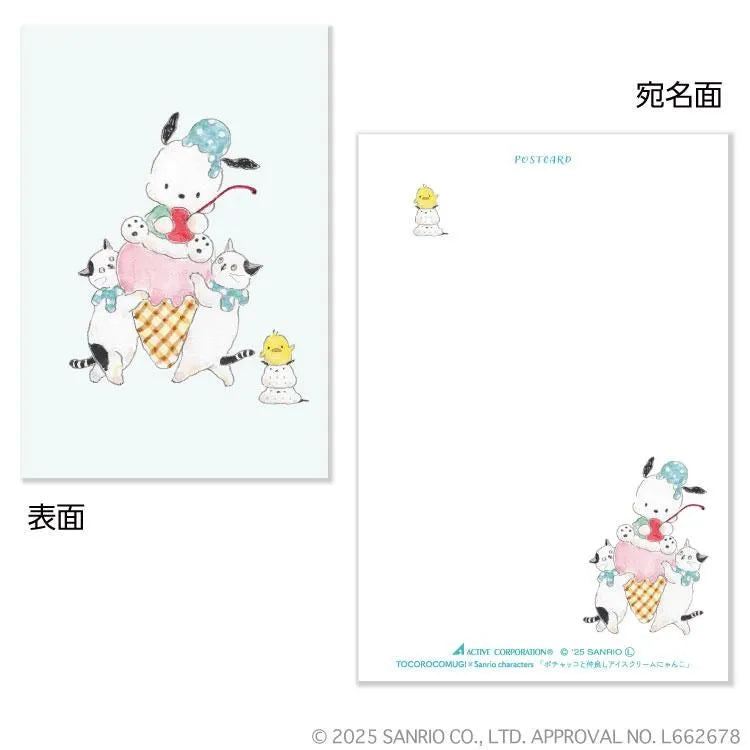 りんごやいちご、あめちゃんにアイス!サンリオキャラクターと一緒に色々なスイーツを楽しむコムギアニマルたちの姿に、思わず笑顔がこぼれる両面フルカラーのポストカードです。