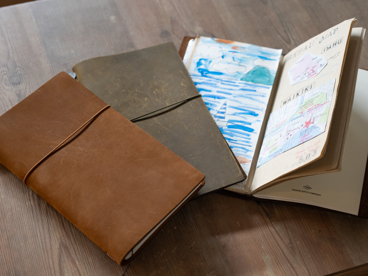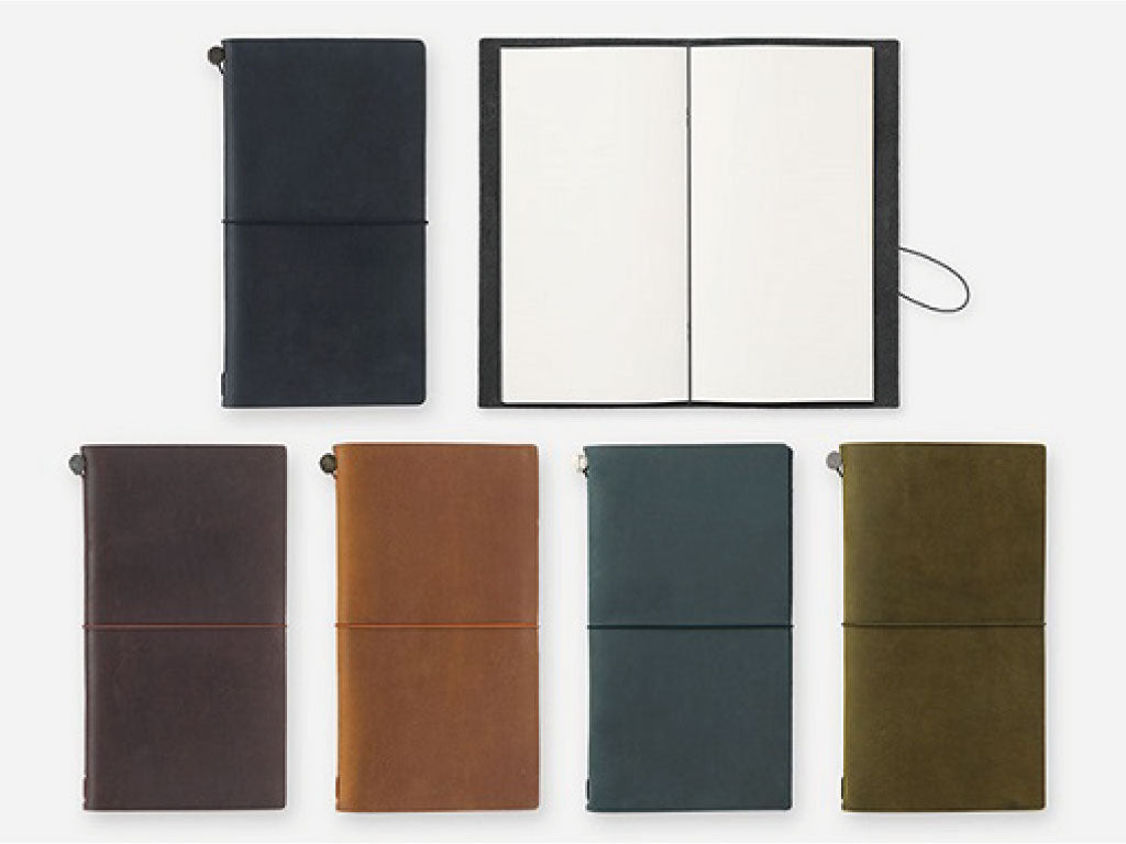使い込むほどに味と風合いが高まる牛革素材のカバーと、書きやすさにこだわったオリジナルの筆記用紙を使ったシンプルなノートがセットになった、トラベラーズノートのレギュラーサイズです。
