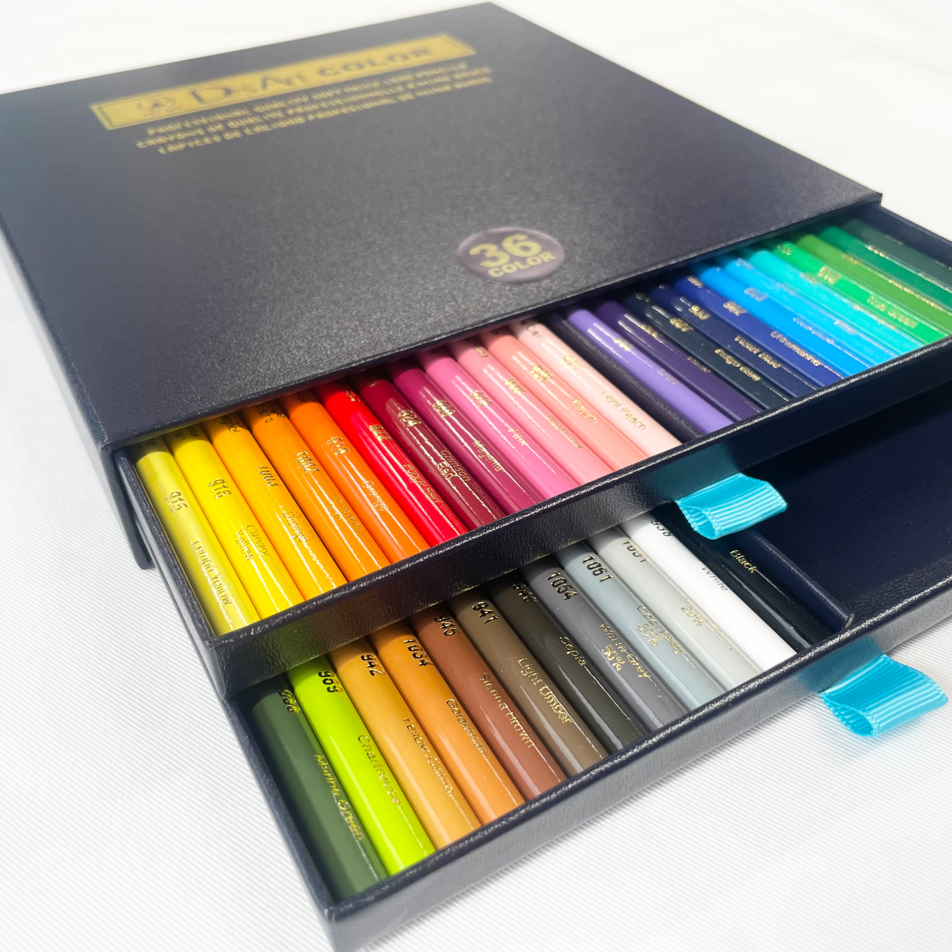 高級感のあるネイビーのレザーペーパー製BOX入りで、使いやすい2段引き出し仕様(24色/36色セット)。
