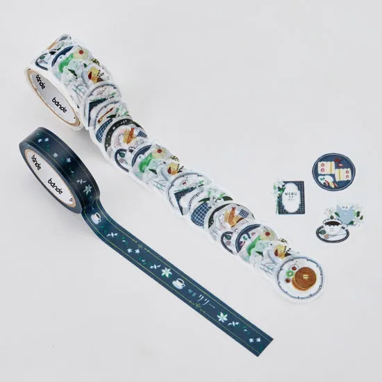 見た目はロールテープのようだけど、引き出して1枚ずつめくって使えるちょっとおもしろいカタチ。シール台紙のない「1枚ずつめくれる」ロールステッカーと、マスキングテープのセットです。めくるたびどんな絵柄がでてくるのか、ワクワクしながら楽しめるbandeならではの形状、じまんの品です。
